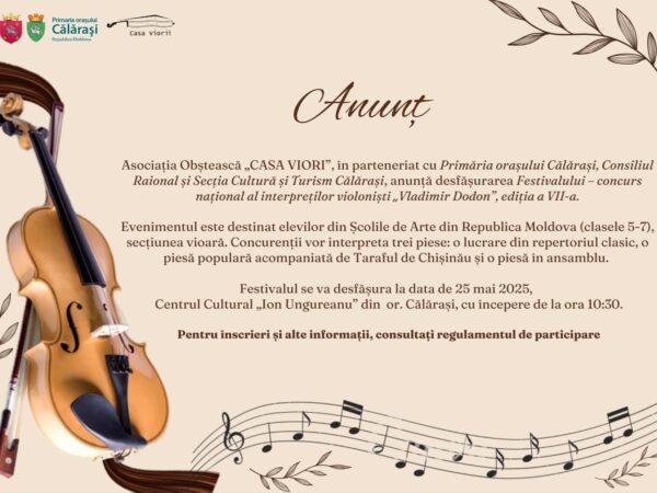 25/02/2025 Anunțuri‚ Știri și evenimente Al șaptelea an, în raionul Călărași, se organizează Festivalul-concurs național ,,Vladimir Dodon”, pentru violoniștii școlilor de arte